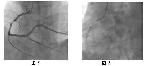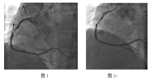患者于2006年5月因“急性下壁心肌梗死”于当地医院急诊造影显示右冠100%闭塞,置入雷帕霉素药物洗脱支架(SES)2枚,未串联。半年后,2006年11月来我院复查冠脉造影,右冠支架内50%狭窄,予药物治疗。