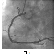 一年后,2013年2月患者再次出现活动时胸痛,特别是在高原地区。第三次住我院,复查冠脉造影:右冠支架内PEB治疗部位再狭窄80%(图5)。本次介入治疗于右冠支架内狭窄部位经球囊预扩张后置入XienceV支架 3.5mm x 23mm, 最大16atm扩张(图6),并用后扩张球囊Quantum 3.5mm x 15mm, 最大24atm 扩张,最终效果满意(图7)。