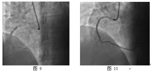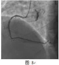 2012年3月发作活动时胸痛,休息可缓解,第一次住我院。入院查体无特殊阳性发现。超声心动图:静息状态下心内结构功能未见异常,LVEF 65%。冠脉造影:右冠支架内再狭窄80%(图8)。同期介入治疗,球囊Fire Star 2.5mm x 15mm预扩,最大14atm,PEB球囊Sequent Please 2.75mm x 15mm, 最大10atm扩张,持续45s(图9)。最终效果满意(图10)。