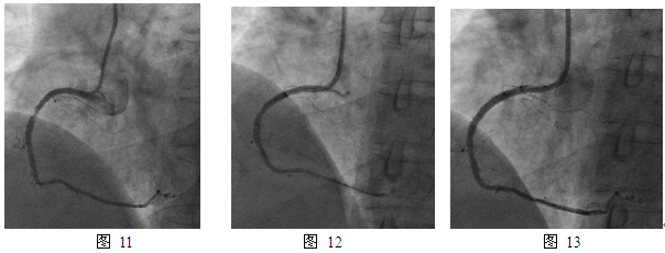 10个月后,患者再次出现活动和安静时胸痛,2013年1月再次住我院。复查冠造,右冠支架内原PEB治疗部位再狭窄80%(图11),再次进行PCI治疗,球囊预扩张后置入Firebird 2支架3.0mm x 18mm,效果满意(图12,13)。术后患者坚持药物治疗,半年临床随访无不适。