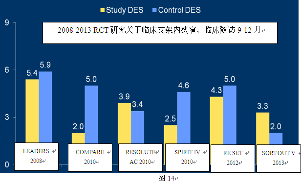 与金属裸支架(BMS)相比,药物洗脱支架(DES)显著降低了支架内再狭窄的发生率。Cassese等2013年在Heart上发表的DHZ再狭窄注册研究显示, 从1998年到2009年,BMS(1998~2002),第一代DES(2002~2005),新一代DES(2006~2009),10 004例患者进行了冠脉造影随访,支架内再狭窄发生率分别为30.1%,14.6%和12.2%。提示随着支架技术的进步,支架内再狭窄的发生率显著下降。图14显示2008年到2013年的一些随机对照研究(RCT)9~12月临床随访显示支架再狭窄的发生率更低,2.0%~5.9%。但是,目前对于DES再狭窄的介入治疗还没有指南,大多通过支架内球囊扩张成形术,或再次置入支架(同种药物或不同药物的DES),或药物洗脱球囊(DEB)进行治疗。