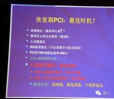 有分析指出,OAT试验事实上也具有一定的局限性,包括入选患者低危和PCI过早原因。其纳入患者以单支病变为主导(6%-7%非IRA行PCI),90%的患者有侧支循环,90%患者运动下不具有或者有轻微缺血,大量存活心肌者有70%;试验中PCI“副作用”明显,其中TIMI 3级血流率仅82%(正常应当>95%),另外,慢血流率高达18%,这是MI增加的主要因素,因此大大抵消了PCI本身的获益;此外,平均PCI实施时间在AMI后第8天,有1/4则在5天内,非该类患者PCI最佳时机。