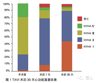 研究显示,通过 30 天的观察,手术成功率为 96.3%,全因死亡率为 4.9%。这与当前一些临床试验如 PartnerA(3.4%)、Partner B(5%)、Core Valve(8.4%)等研究术后 30 天时死亡率可比。4 例死亡患者,1 例死于肺部感染、1 例死于循环衰竭,1 例死于多器官功能衰竭,1 例发生猝死原因不明。