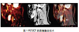 18-fluorodeoxyglucose(18-FDG)是一种PET示踪剂,被有代谢活性的细胞摄取(包括斑块内的巨噬细胞),经过磷酸化后可在细胞内存留,可作为巨噬细胞活性的评估方法。Ogawa 等发现住动脉粥样硬化斑块内 18-FDG 的摄取量是正常主动脉摄取量的 3~5 倍。Rudd 等用 FDG对有颈动脉粥样硬化病变症状的患者做PET 检查,结果显示和稳定性斑块相比,不稳定、高危斑块的FDG聚集明显增加。这些结果表明FDG可用于评价斑块的易损性,因为激活的巨噬细胞数量的增加和斑块的不稳定有相关性。由于 PET 的空间分辨率低,不能对检测的分子水平的异常信号进行准确的解剖定位,而PET/CT可克服这一不足,将功能成像与解剖定位相结合,存在了优越性和潜在的应用价值(图1)。