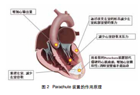 Parachute是第一个居于导管技术设计的经皮左室重建(PVR)装置,旨在缩小左室容积、改善左室形态的同时减少手术的风险。该装置是由含氟聚合物(聚四氟乙烯)薄膜覆盖在一个镍钛合金锥形框架(图1),其可以放置到左室心尖部并将梗死的心肌与左心室隔离。该装置作用原理包括通过改变左室的形态减少左室底部室壁的张力、用柔软的Parachute装置替代僵硬的心肌疤痕从而增加心室顺应性、消除室壁瘤矛盾运动 ,从而起到减少心室舒张末压力、减少左室容积及增加心输出量的血流动力学效果,最终使得患者心功能改善及症状得到改善,并有可能改善远期生存(图2)。