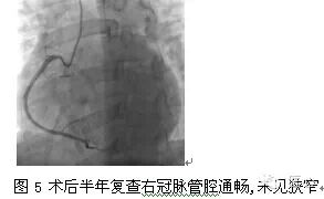 出院后规律服药,但仍反复活动时心前区憋闷疼痛,向左肩背部放射,伴发力气短,每次持续10余分钟至半小时,经休息可缓解。支架术后半年时冠脉造影复查。冠脉造影示:右冠管腔通畅,未见狭窄,TIMI血流3级(图5);左冠脉原支架通畅,可见明显弥漫瘤样扩张,以前降支近中段为主,TIMI血流3级(图3、图4)。术后予以继续前述药物治疗方案,瞩终身服用阿司匹林及华法林。