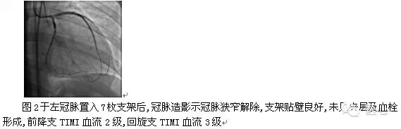再于回旋支远段置入依维莫斯涂层的2.25 mm x 24 mm支架1枚,以14 atm压力释放,支架释放时间为2秒,造影示冠脉残余狭窄消失,未见冠脉夹层及血栓形成,支架贴壁良好,前向TIMI血流3级。对于前降支与回旋支分叉处病变,拟采用CULOTTE技术(裙裤支架技术),先于回旋支近段置入依维莫斯药物涂层的3.0 mm x 28 mm支架1枚,与回旋支远段支架近段重叠3 mm,以16 atm压力释放,支架释放时间为2秒,再于前降支近段置入雷帕霉素3.5 mm x 36 mm支架1枚,以16 atm压力释放,支架释放时间为2秒,造影示前降支中段可见夹层形成,于前降支中段再置入雷帕霉素3.0 mm x 12mm支架1枚,以16 atm压力释放,支架释放时间为2秒,造影示夹层消失,支架贴壁良好,前向TIMI血流3级。