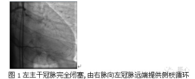 超声心动图示:左室舒张末期内径为54 mm,左室收缩末期内径为47 mm,左室射血分数(EF)为30%(以2D方法测得),左室下后壁及后侧壁基底段至心尖段心肌变薄,运动及增厚率明显减低,二尖瓣少量返流,心包少量积液(左室后壁积液5 mm,右房顶积液10 mm)。肌钙蛋白0.27 ng/dL,曾行冠状动脉(冠脉)造影示:左主干冠脉完全闭塞,由右脉向左冠脉远端提供侧支循环(图1)。心外科医师评价该患者行CABG术风险高,建议行介入诊治,于2011年12月21日转入心内科病房诊治。
