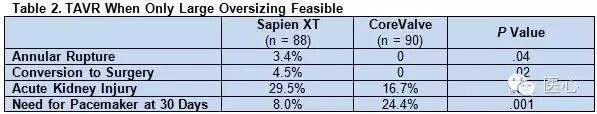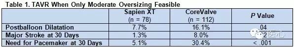 中度扩张组和重度扩张组接受两种瓣膜的患者手术特征和临床转归相似。重要的是,瓣周漏程度也无差异。然而,对于中度扩张组患者,接受CoreValve瓣膜的患者进行球囊后扩张的可能性较大,主要卒中发生率和30天需要起搏器植入率也都较高。对于重度扩张组患者,接受Sapien XT瓣膜的患者发生瓣环断裂、转换成外科手术及急性肾损害的风险均较高,但30天需要起搏器植入率较低(见表1和表2)。
