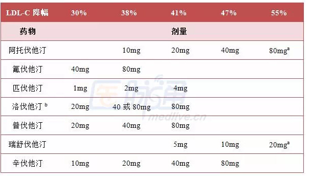 注:摘自美国食品药品管理局网站(http ://www.fda.gov/Drugs/DrugSafety/ucm256581),基于单个他汀类药物、非老年人疗效数据,他汀类药物非直接疗效比较数据;a高强度:他汀类每日剂量降低LDL-C≥50%,中等强度:他汀类每日剂量降低LDL-C 30%-50%,低强度:他汀类每日剂量降低LDL-C<30% ;b血脂康1.2 g/d可使LDL-C降低28. 5%。