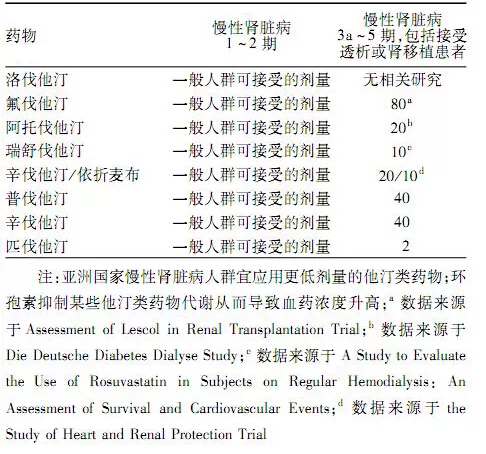 肾功能不全者容易发生他汀类药物相关的不良反应,因此对于肾功能受损(GFR<60 ml•min-1•1.73 m2)者推荐使用目前临床试验已经证实安全有效的剂量: