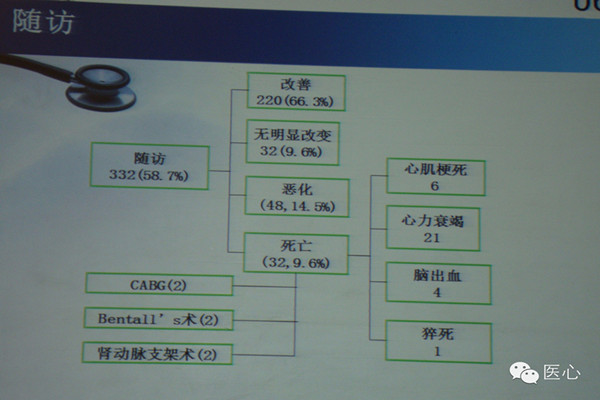 她介绍到,该研究查阅2001年至2013年在阜外医院住院的大动脉炎患者的病例,入选566例患者(男性=118例,女性448例),大动脉炎病程7.6±0.4年,平均入院年龄36.3±13.4岁,平均发病年龄28.9±12岁。采用单因素和多因素Cox回归分析分析患者预后。