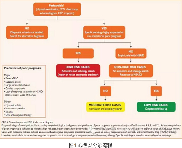 * 至少符合下列条件之一者为高危:高热(>38°C),亚急性病程无明确的急性发作、大量心包积液(如,舒张期无回声区>20 mm),心脏填塞,NSAID治疗无反应,心肌心包炎,免疫抑制,外伤或口服抗凝药治疗。