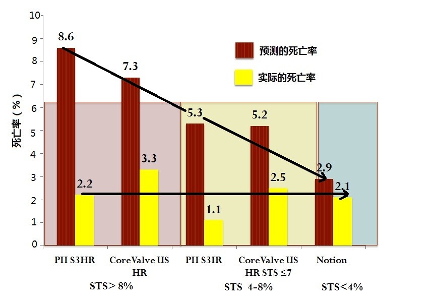 图2.预测的外科手术死亡率与TAVR围手术期死亡率的关系 (PIIS3HR,PARTNER II 研究高危组;CoreValve US HR,美国CoreValve研究高危组;PIIS3 IR,PARTNER II 研究中危组;Notion,Notion 研究)