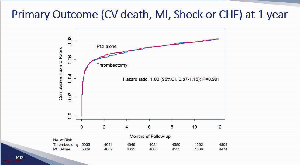 Jolly在总结中提出,基于TOTAL1年结果,手动抽吸不再被建议用于STEMI患者的常规治疗。
