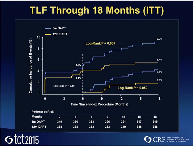 中国医学科学院阜外心血管病医院徐波教授在TCT2015大会上报告了I-LOVE-IT 2试验亚组18个月数据。结果显示,分叉病变患者置入新型生物可吸收聚合物西罗莫司洗脱支架(SES)或需进行12 个月双联抗血小板治疗(DAPT),而非6个月DAPT。较短的DAPT或可增加患者18个月临床靶病变血运重建(TLR)风险。