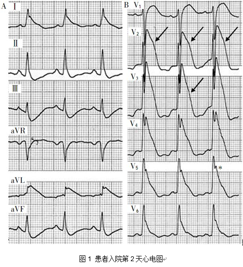 急诊心电图(图1)示:窦性心律,心率91次/min,各导联QRS波群宽大畸形,QRS时间0.20s。Ⅱ、Ⅲ、aVFQRS波群呈R型,R波粗钝,Ⅰ呈R型,ST段呈下斜型抬高,aVL呈qR型,胸导联V1呈rS型,ST段弓背型抬高0.3mV,V2呈RSR′型,ST段抬高似Brugada波样改变(箭头示),V3呈巨R型,波峰明显切迹。ST段呈下斜型抬高,终末T波浅倒置。V4~V6QRS波群呈高大R型,波峰明显切迹。V5R波切迹酷似缺血性J波(星号示)。心电图诊断:急性广泛前壁心肌梗死。