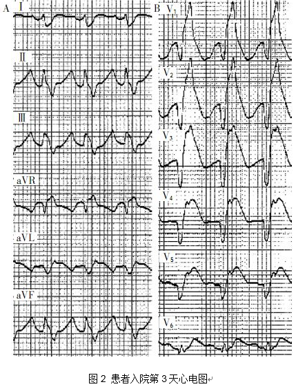入院第3天复查心电图(图2)示:窦性心动过速(心率149次/min),各导联QRS波群更宽大畸形,电压明显降低。Ⅱ、Ⅲ、aVF呈RS型,aVR呈Qr型。ⅠQRS波群由R型转为rs型,aVL由qr型转为Qr型。胸导联V1~V5呈QR型,ST段明显抬高0.3~1.2mV。V6呈Qrs型。心电图诊断:窦性心动过速,急性广泛前壁心肌梗死。患者自动出院。