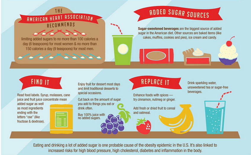 (4)指南首次明确制定添加糖摄入量,低于每天摄入热量的10%。这让居民更加清楚糖摄入量。比如,每天摄入2000热量的居民,糖摄入量应低于200 卡路里,这比20 oz.糖饮料都低。AHA鼓励添加糖限制,特别是添加糖的饮料,比如日常碳酸饮料、运动饮料和水果口味饮料。AHA和该指南均认为食物和饮料中热量较高,这与肥胖有相关性,也或是心血管疾病(心脏病发作和心衰)主要的危险因素。