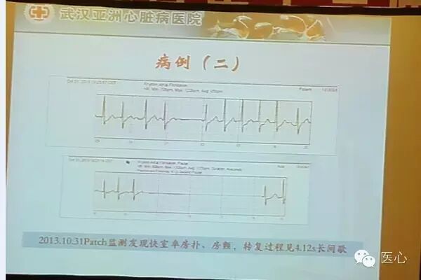 2011年6月因“冠心病单支病变”行PCI术,2013年3月起反复黒朦、晕厥,晕厥前有心悸不适。每次持续时间仅数分钟,多次行24 h动态心电图均未见异常,2013年10月佩戴Patch监测发现快室率房扑、房颤、转复过程见4.12 s长间歇(见图7)