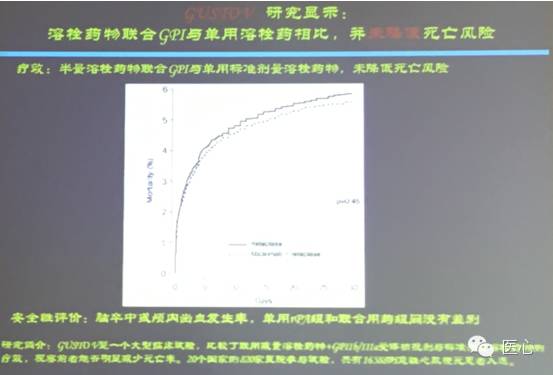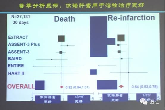 临床医师不愿进行溶栓的主要原因是出血风险,减少出血的方法如下:根据年龄、肾功能调整抗凝和溶栓剂剂量,合理选择抗凝剂;溶栓后的PCI尽量桡动脉入路;溶栓后合理选择抗血小板药物比如P2Y12抑制剂的选择,GPI尽量避免使用);最后使用PPI预防GI出血。在STREAM研究中,在入组了20%的患者时,发现药物-介入组颅内出血发生率显著高于PPCI组(0 VS 2.6%);然而,在调整剂量后,两组颅内大出血发生率相似(0.3% VS0.5%)。EXTRACT-TIMI25试验结果显示,依诺肝素用于STEMI患者溶栓治疗,显著减少死亡和非致死性再梗;荟萃研究显示:依诺肝素用于溶栓治疗更好(见图11),且2013 ACC指南对STEMI溶栓患者行补救PCI的推荐依诺肝素为Ⅰ类推荐。GLARITY-TIMI 28 推出:在阿司匹林基础上联合氯吡格雷可显著降低溶栓患者死亡/再梗发生率。还有研究显示:溶栓药物联合GPI与单独溶栓药物相比,并未降低死亡率(见图12)。