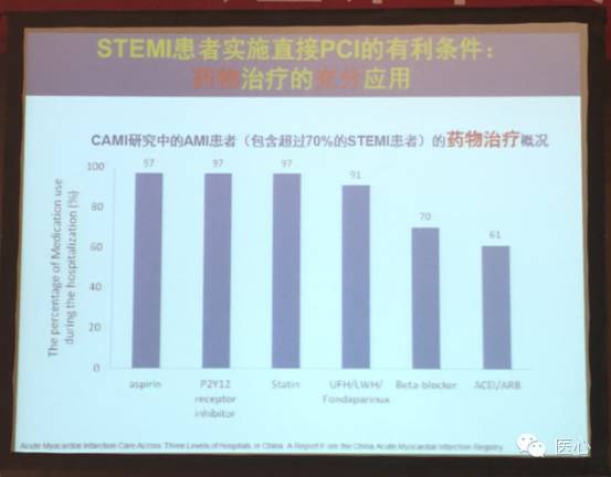 目前,我国STEMI患者实施直接PCI的存在很多有利条件。首先,CCU以及导管室的配置率较好,县级医院CCU和导管室配置达到78%和44%,省级医院更是高达100%和100%(见图3)。其次,药物治疗的充分应用,比如阿司匹林的应应用高达97%(见图4),这也保证了直接PCI的顺利进展。