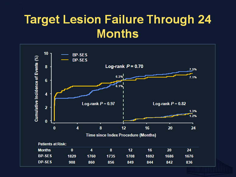 2737 例符合冠状动脉支架置入术标准的患者,按 2:1 比例随机分组,接受 BP-SES(n=1829)或 DP-SES (n=908)治疗,两组基线临床特征、基线病变特征均 无明显差异。随访到 24 个月,BP-SES 组和 DP-SES 组 的靶病变失败(TLF)发生率分别为 7.5% 和 7.1%(P=0.7), 无显著性差异,并且界标性分析(landmark analysis)显 示两组统计学曲线在 1 年后近于重叠(1.2% vs 1.3%, P=0.82)(见下图)。其中两组心源性死亡发生率分别为 1.0% 和 0.9%(P=0.69),靶血管心肌梗死发生率分别为 4.3% 和 4.0%(P=0.7),临床症状驱动的靶病变血 管重建发生率分别为3.5% 和 3.1%(P=0.62),患者相关复合终点发生率分别为 12.5% 和 11.7%(P=0.51),确 定 及 可 能 的 支 架 血 栓 发 生 率 分 别 为 0.6% 和 0.7% (P=0.55),均无显著差异。