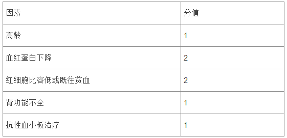 随后研究人员在上述预测因子中选取了 5 个最强的预测因子:高龄(>75 岁)、血红蛋白下降(男性 <13 mg/dL,女性 <12 mg/dL)、红细胞比容低(男性 <40%,女性 <36%)或既往贫血、出血史、肾功能不全(肾小球滤过率 <60 mg/dL/1.73m2)、并根据实际情况对他们做出了不同的预测分值:高龄 1 分、血红蛋白下降 2 分、红细胞比容低或既往贫血 2 分、肾功能不全 1 分、抗性血小板治疗 1 分,件表 1。