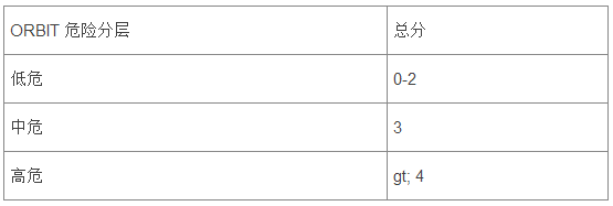 研究人员同时对危险评分进行了分层:低危 0-2 分,中危 3 分,高危大于 4 分,见表 2。