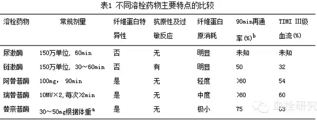 2.特异性纤溶酶原激活剂:临床最常用的为人重组t-PA(rt-PA,阿替普酶),系通过基因工程技术制备,具有快速、简便、易操作、安全性高、无抗原性的特点(半衰期4~5min)。可选择性激活血栓中与纤维蛋白结合的纤溶酶原,对全身性纤溶活性影响较小,因此出血风险降低。目前,其他特异性纤溶酶原激活剂还包括基因工程改良天然溶栓药物及t-PA的衍生物,主要特点是纤维蛋白的选择性更强,血浆半衰期延长,适合弹丸式静脉推注,药物剂量和不良反应均减少,使用方便。已用于临床的t-PA 的突变体有瑞替普酶(r-PA),兰替普酶(n-PA)和替奈普酶 (TNK-tPA)等。GUSTO 研究显示,rt-PA加速给药组开通冠状动脉优于链激酶,每治疗1000例患者减少10例死亡。临床研究提示r-PA和TNK-tPA与t-PA加速给药疗效相似,但是给药方便,更适合院前溶栓。不同溶栓药物的比较见表1。