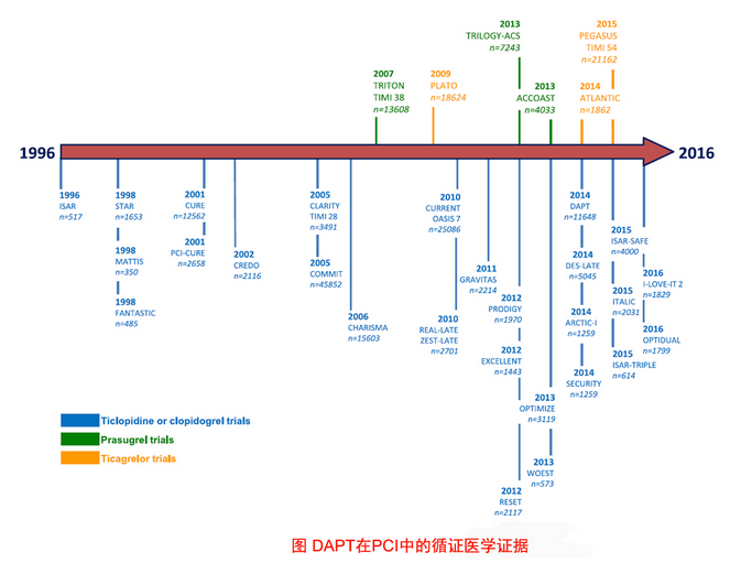 经皮冠状动脉介入治疗(PCI)已广泛应用于临床,而PCI术后双联抗血小板治疗(DAPT)的最优疗程问题却仍亟待解决。20年来的循证医学证据证明,延长DAPT疗程可使长期动脉粥样硬化风险降低,包括支架内血栓形成、心肌梗死(MI)。然而,也有众多证据表明,随着新一代药物洗脱支架(DES)的诞生,支架相关结局的获益或因此被削弱。