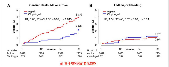 从这项研究可以看出,对于经过12个月DAPT治疗,之后采用抗血小板单药治疗的患者,氯吡格雷较阿司匹林的获益更大。除此之外,CAPRIE研究高危患者的亚组分析同样显示,在既往心脏手术、糖尿病、有缺血事件史的患者中,氯吡格雷获益也更大。