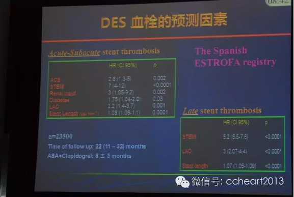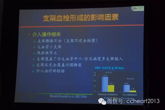 DES血栓形成的机制比较复杂,早期支架内血栓形成(≦1个月)可能存在“机械性”原因,比如造影和临床预测因素;晚期支架内血栓形成(>1个月)可能与内皮华异常、支架易位、晚期贴壁不良/血管瘤形成、抗血小板治疗、药物支架和释放药物、冠脉病变进展有相关性。同时,DES血栓形成与支架平台、聚合物及传送系统都有相关性。