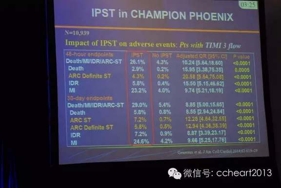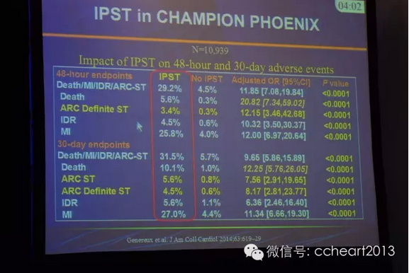 支架血栓形成的影响因素主要包括临床因素(见图2)、病变特征(见图3)、介入操技术(见图4),及介入术中支架血栓形成(见图5)。值得一提的是,介入术中支架血栓早在2005年就被提出,并不是一个新概念,但是一直以来都被临床忽视。术中支架血栓表现为术中血管颜色变淡或出现跟血栓相关的急性闭塞。研究显示术中支架血栓的发生率为0.8%,会增加30天死亡率(见图6)。CHAMPION PHOENIX试验研究术中支架血栓对48 h和30天不良事件的影响,结果显示,术中支架血栓会显著增加48 h 和30天ARC确定的支架血栓发生率(见图7、8)。总体而言,术中血栓在PCI中的发生率约为1%,是短期死亡率的强独立预测因素,也是介入术后支架血栓的独立预测因素,更会延长患者住院时间(见图9),应引起临床关注。