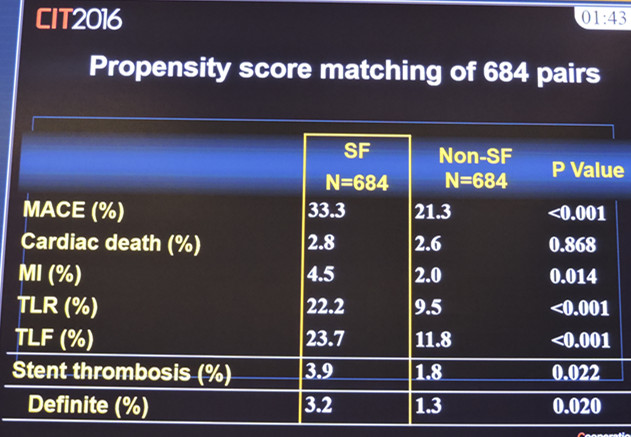 6555例患者临床随访结果中,SF患者支架再狭窄率(42.1% vs 9.5%)、靶病变血运重建(26.3% vs 8.6%)、支架血栓(5.5% vs 1.3%)发生率均高于非SF患者(P均<0.001)。同时,SF患者动脉瘤(6.00% vs 0.70%)、血管闭塞(5.10% vs 0.30% ) 、主要不良心脏事件(37% vs 15.2%)也更高。在随后倾向评分匹配684对患者中,这一结果持续存在(见图3),并且根据Kaplan-Meier幸存率分析,SF组低于非SF组。