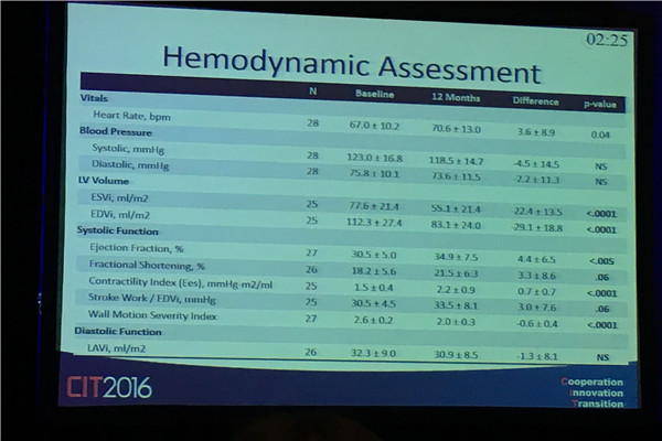 中国入组的30例PVR术后一年结果,其中共28例患者接受了1年随访。主要终点为左室收缩末期容量指数(LVESVi);次要终点为NYHA和生活质量VAS评分。
