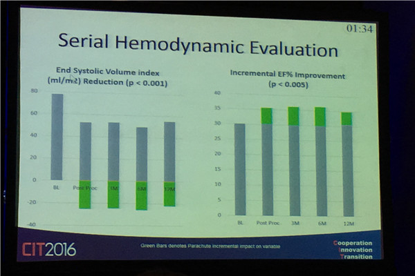 急性心肌梗死发生后由于心肌损伤以及随后的瘢痕化,导致心脏扩大以及心力衰竭的发生,尤其是前壁心肌梗死合并室壁瘤的患者更容易发生心力衰竭,不仅影响患者的生活质量,还造成巨大的家庭和社会的经济负担。作为心脏病最终结局之一,心衰的5年生存率甚至比某些恶性肿瘤还低。急性心肌梗死后由于心肌损伤以及随后的瘢痕化,导致心脏扩大以及心力衰竭,前壁心肌梗死合并室壁瘤的患者更易发生心衰。“经皮心室重建术”正是针对陈旧前壁心肌梗死伴心衰患者的新治疗方法。这项技术的成功应用,将把患者的五年存活率从百分之二三十提高到百分之七八十。在CIT2016大会上,北京大学第一医院霍勇教授对多中心、前瞻性、单组临床评价Parachute经皮介入左心室隔离装置系统安全性和有效性的一年研究结果进行了报告。
