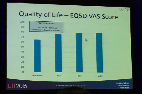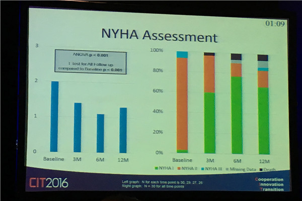 一年随访结果显示,LVESi指数与基线相比下降了22.4±13.5ml/m2;NYHA指数与基线相比有相当程度改善;患者的生活质量EQ5DVAS 评分也呈上升趋势。12个月具体结果(见下图4~8)