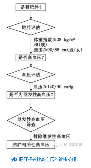 2. 肥胖和高血压孰因孰果尚难确定。不过体重指数(BMI)和腰围超标均与国人高血压及心血管病风险独立相关,二者均超标可进一步增加心血管风险。具体诊断流程见图2。