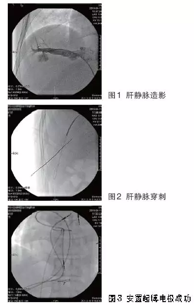 经心内科全科讨论,起搏介入组的方元教授和先心病介入组的冯沅教授制定了经肝静脉穿刺安置双腔起搏器的方案。患者在X线透视下,由消化科魏波医生穿刺肝静脉成功,经肝静脉置入两根8F可撕脱鞘。沿穿刺鞘置入心房和心室螺旋电极,固定稳妥,起搏阈值良好。于是术者在患者右上腹皮下做起搏器囊袋,置入起搏器脉冲发生器,并予以逐层缝合。术中及术后患者感觉良好。