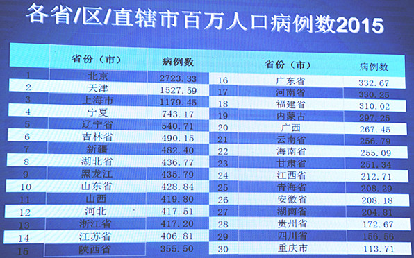 从各省/区/直辖市病例数来看,各省份病例数都超过千例,北京市、山东省和广东省病例数位居前三,并且排在前22位的医院病例数都在一万例以上,而大部分的数据还是集中人口比较密集的城市,比如北京、上海、河南、山东(见图3)。从各省/区/直辖市百万人口病例数来看,排名发生很大了变化,前三甲分别为:北京市、天津市和上海市。同时,以2010年第六次人口普查为基准,我国平均百万人口仅有426.82例患者接受介入治疗(见图4),前10名省份都在平均数以上,其余都在平均数以下。然而,这些数据远远低于法国、新加坡等发达国家,由此可见我国冠心病介入治疗具有很大的发展空间。