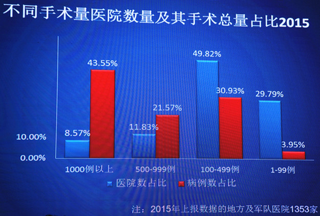 从2014年和2015年不同手术量医院数及其病例总数来看,1000例以上的医院手术总量占总医院数的8.57%,手术总量占总病例数的43.55%,而1~99例的医院这一比例分别为29.79%和3.95%,这反映了我国大陆地区介入治疗水平及医院规模发展不平衡(见图5)。