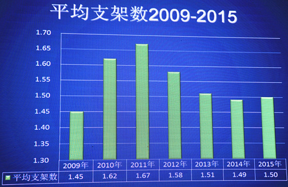 2015年,PCI患者中男性稍高于女性,PCI危险因素中,高血压(45.23%)位居第一,其次为吸烟(20.75%),高血脂位居第三(20.37%)。2009年~2015年期间, 2011年介入治疗发展最快,PCI患者平均支架数最高,为1.67个,但之后临床医师和患者都趋于理性,平均置入支架数保持在1.5个左右。平均支架数全国前十名医院的数据在逐年下降(见图6)。