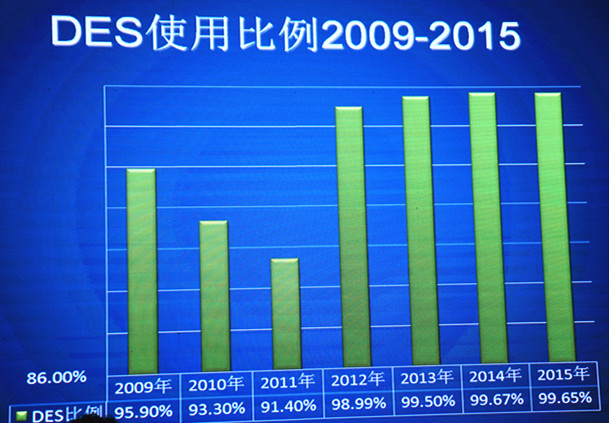2009年~2015年,药物洗脱支架(DES)使用比例在2010年和2011年有所下降,主要是因为DES与金属裸支架交替的时候。2012年之后这一比例逐渐增加,2015年高达99.65%(见图7),这也侧面反映了DES的临床疗效得到广泛认可。