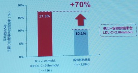 ACCORD血脂研究发现,经他汀治疗LDL-c达标的TG≥2.3 mmol/L且低HDL-c患者的心血管风险显著高于其他患者。(如图2)