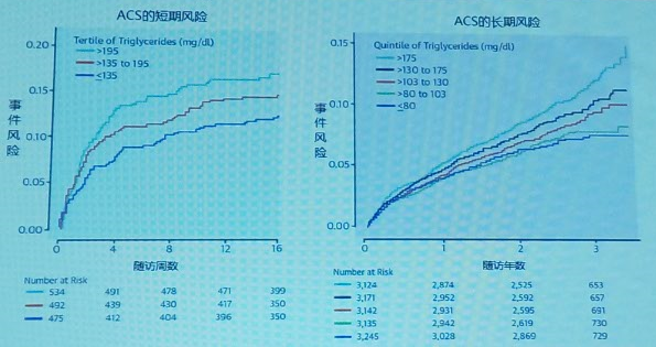 Dal-OUTCOMES和MIRACL研究显示,空腹TG水平升高与ACS的短期及长期风险密切相关(如图3)。以上研究均说明,TG的升高与心血管疾病患者的长期预后相关。