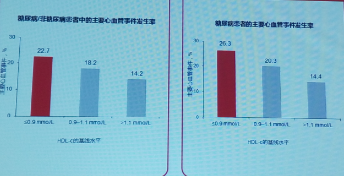 CTT荟萃分析了14个应用他汀类药物的随机临床试验,统计糖尿病/非糖尿病患者的主要心血管事件发生率发现,HDL-c水平越低主要心血管事件发生率越高;即使对于单纯糖尿病患者该结果也一致。