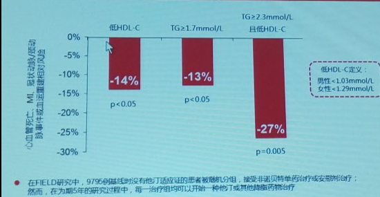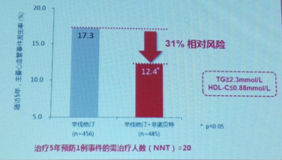 6.在他汀治疗下,TG水平升高、HDL-c水平较低的高危患者可以从非诺贝特和他汀联合治疗中获益。