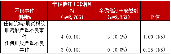 与非诺贝特或他汀单药治疗相比,非诺贝特和他汀联合治疗并没有导致严重不良事件的发生率升高。
