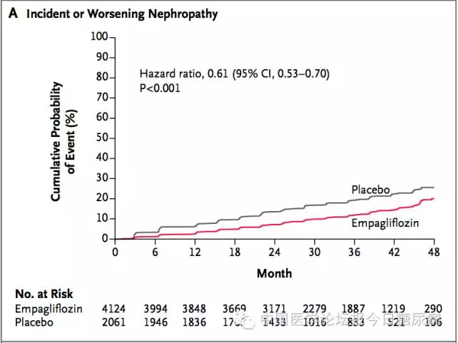 1.事件性或逐渐恶化的肾病发生率在恩格列净组为12.7%(525/4124),在安慰剂组为18.8%(388/2061),两组具有统计学差异(P<0.001);